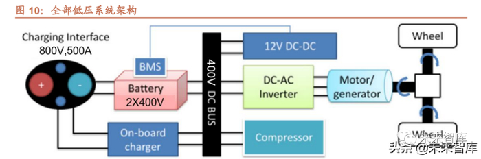 (2)部分高压,即 800V 电池+400V 电机、电控+400V OBC、DC/DC、PDU +400V 空调、PTC。