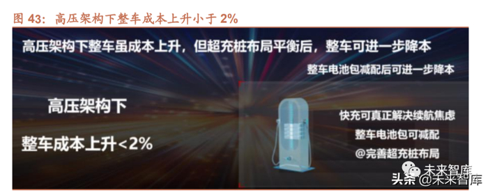 劣势:该架构不仅对电池系统要求很高,电控、OBC、DC/DC 中功率器件需要由 Si 基 IGBT 替换成 SiC MOSFET, 电机、压缩机、PTC 等均需要提升耐压性能,短期车端成本提升较高,但长期来看,产业链成熟以及规模效应具备之 后,部分零部件体积减小,能效提升,整车成本会下降。