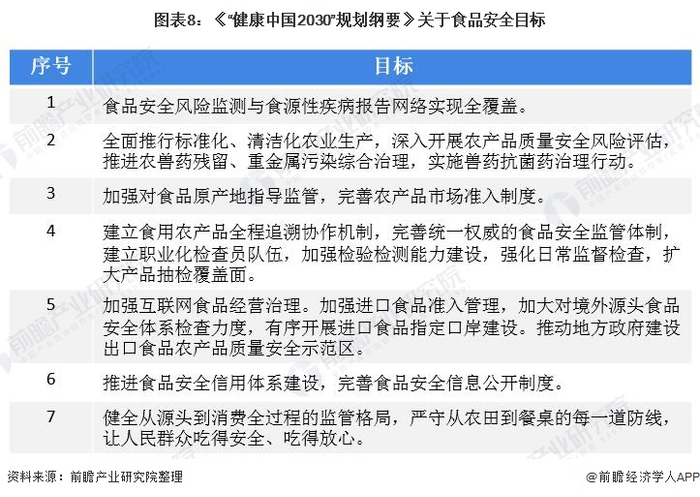 2019年7月10日,中共中央国务院印发《“健康中国2030”规划纲要》,将保障食品安全作为健康中国的重要组成部分,并首要提出了到2030年完善食品安全标准体系的规划目标。