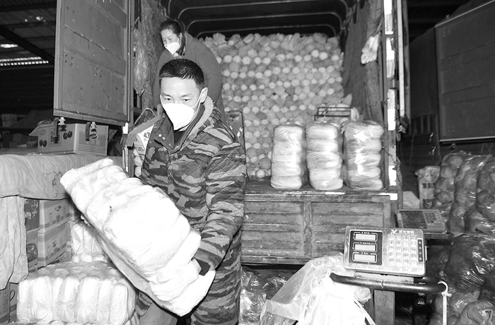 图为在西安市胡家庙蔬菜批发市场,工作人员搬运即将投放市场的储备菜。张博文 摄