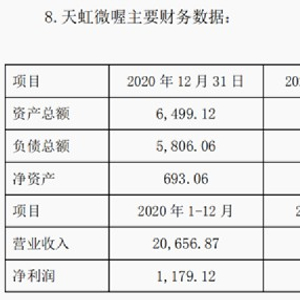 截止到2021年9月30日,天虹微喔的总资产为1.05亿元,总负债为1.07亿元,净资产已经为-152.67万元,而且在2021年前9个月营业收入2.11亿元的情况下,净利润为-774.80万元,处于亏损的状态。
