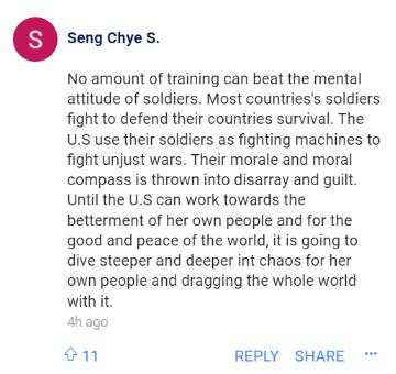 还有网友说:“再多的训练也挫败不了士兵的心态。大多数国家的士兵为保卫国家的生存而战。美国却把他们的士兵当作战斗机器去打非正义的战争。他们的士气和道德指南陷入了混乱和内疚之中……”↓