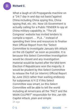 有人说:“真是笑话,美国的宣传机器一周7天一天24小时不停地针对中国,包括中国刺探这个,刺探那个等等。现在美国政府实际上要求公开招标来监视中国的军事能力。美国国会网站已邀请投标编制一份报告……而不是花时间和资源尽快完成‘特别委员会调查1月6日美国国会大厦遇袭事件’的官方报告……”↓