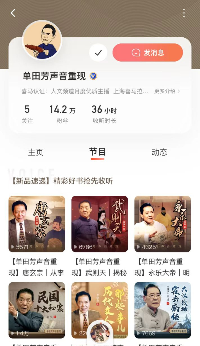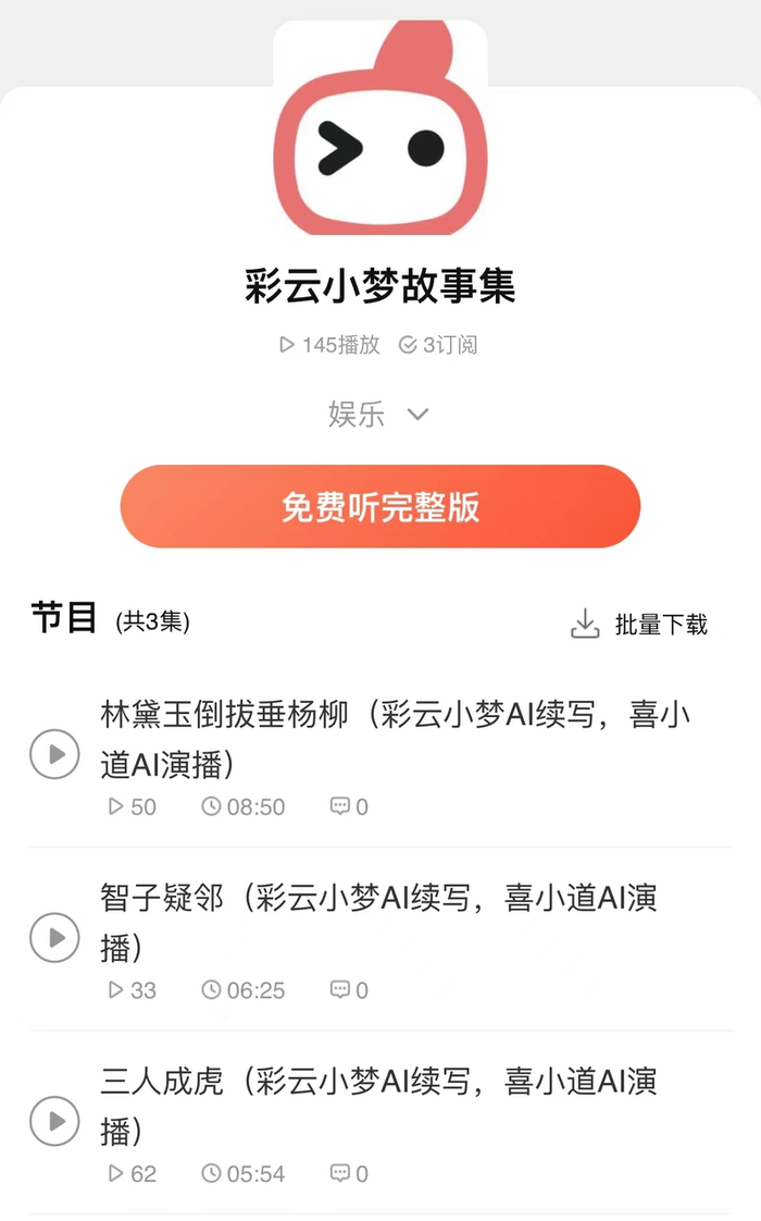“彩云小梦”主页除AI主播“喜小道”,目前,TTS技术已经支持喜马拉雅在相声评书、电子书、新闻等领域实现了突破,能够高效地将新闻、书籍和文章中的大量文字信息转为音频,这些TTS内容上线后也获得了较大的收听量。2021年,喜马拉雅用TTS技术完美还原单田芳先生的声音,并首次将单田芳先生的AI合成音应用于风格各异的书籍,用单氏评书腔调,全新演绎听众耳熟能详的经典之作,至今,喜马拉雅上已有80多部运用还原自单田芳先生声音制作的专辑。值得一提的是,运用TTS技术重现单田芳声音版本的《毛氏三兄弟》和历史类作品,其声音完播率远超过普通人声作品,这也为未来出版物大量有声化提供了新的解决方案。
