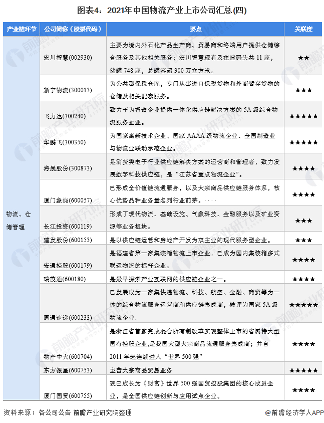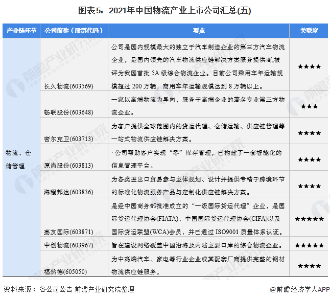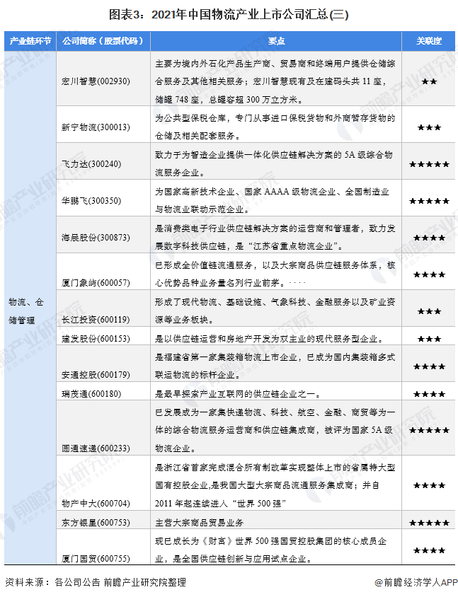 物流为“实物分配”或“货物配送”,是供应链活动的一部分,是为了满足客户需要而对商品、服务消费以及相关信息从产地到消费地的高效、低成本流动和储存进行的规划、实施与控制的过程;是经济发展的重要组成部分。目前,我国物流产业的上市公司数量较多,分布在各产业链环节。具体包括: