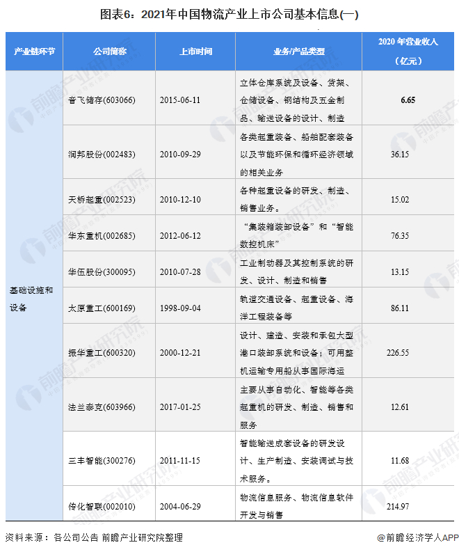 基础设施和设备上市公司:音飞储存(603066)、润邦股份(002483)、天桥起重(002523)、华东重机(002685)、华伍股份(300095)、太原重工(600169)、振华重工(600320)、法兰泰克(603966)、三丰智能(300276);