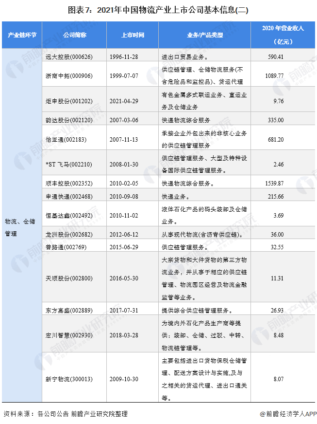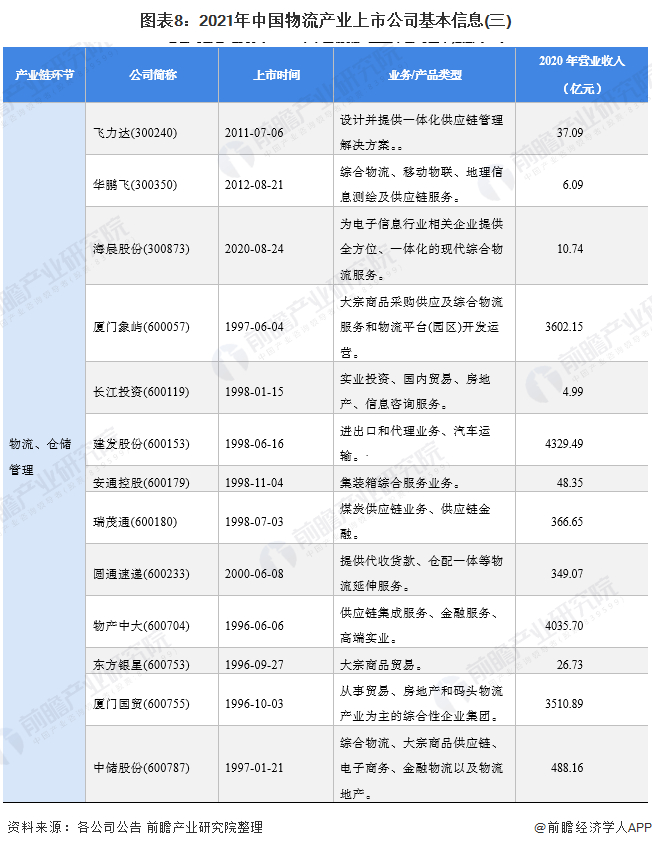 目前,我国物流行业的龙头上市公司有顺丰控股、华贸物流、中国外运、德邦股份、圆通速递、韵达股份、申通快递、传化智联和中储股份,以上公司的2020年物流业务营收超过100亿元,其中顺丰控股2020年物流业务营收高达1517.43亿元;以及布局整个供应链的龙头企业厦门象屿、建发股份和厦门国贸。