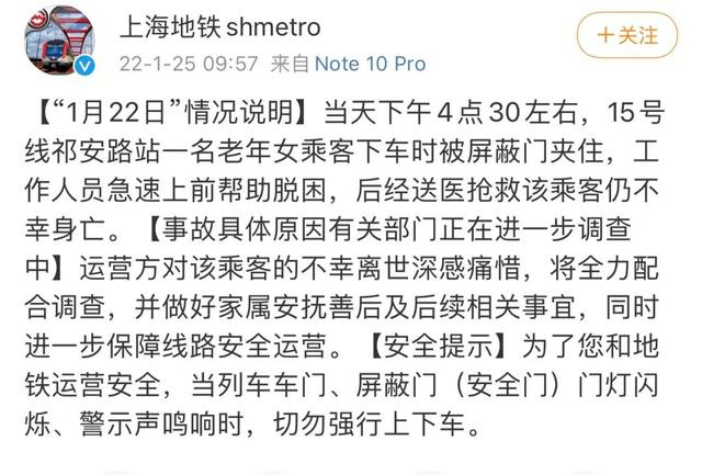 今日9时许,@上海地铁shmetro官微针对女乘客被屏蔽门被夹身亡发布声明: