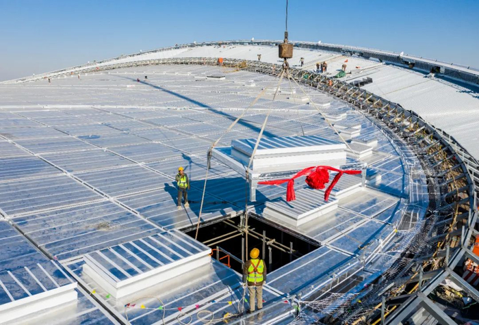 当地上框架如火如荼安装时,钢结构环桁架也在紧锣密鼓搭建,这是拔地而起的最大难点。“环桁架相当于网球拍外沿的箍,索网结构相当于中间的网。”环桁架被切割成东西南北四个部分,当分别完成后,再拼接到一起。