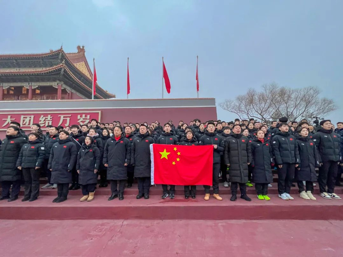 1月25日清晨,来自北京冬奥会中国体育代表团的100多名运动员和教练员代表,来到天安门广场观看升国旗仪式,并宣誓出征。