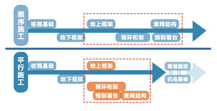 从第二阶段开始,项目部创新使用了施工方法,将安装地上框架、钢结构环桁架和预制看台同时进行,最后安装索网结构,这被称为平行施工。“以前是第二拨人干完了,第三拨人、第四拨人干。现在是第二、三、四拨人同时干。”李少华说,这实现了让不同的人在不同场地干不同的事,“用空间换时间”,最后用“拼积木”的方式,将各阶段成果连在一起。