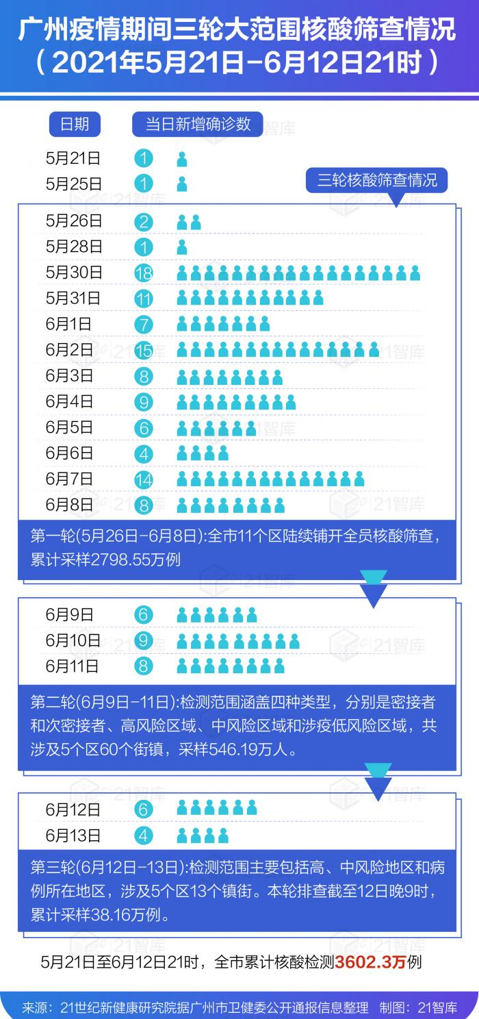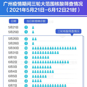 截至6月12日,广州全市先后启动三轮大范围全员核酸筛查。5月21日至6月12日21时,全市累计核酸检测3602.3万例,发现阳性感染者43例,主要集中在重点区域、重点人群。