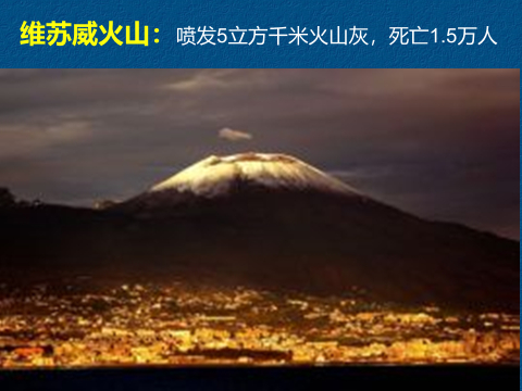 维苏威火山喷发,形成了庞贝古城。该火山喷发造成重大伤亡的关键是当时人们认为该火山是死火山,在山麓建城。
