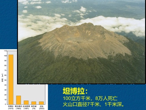 坦博拉火山是人类有记录以来最大的火山喷发,喷发量达到100立方千米,属于7级火山喷发。
