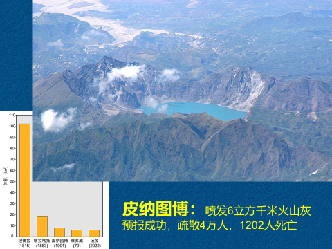 1991年皮纳图博火山喷发属于6级火山喷发,喷发量6立方千米,释放的二氧化硫约为2000万吨,曾导致全球降温约0.5度。皮纳图博火山喷发前,因为预报,转移了4万多人,但也造成1202人死亡。