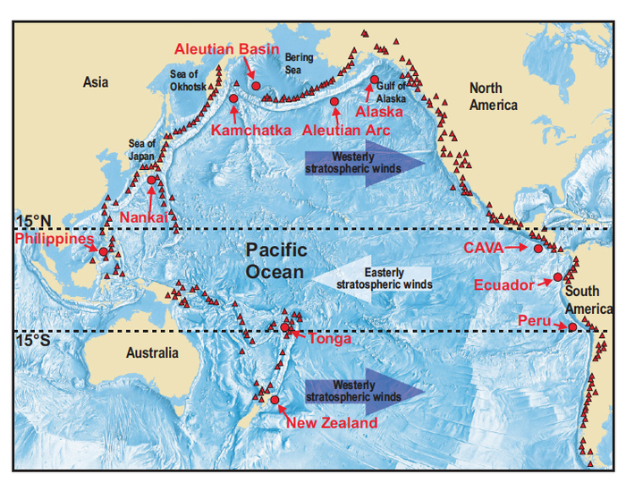 图4 汤加洪阿·哈阿帕伊火山位于西太平洋汤加-克马德克俯冲带上。(上图来自Kutterolf 2012, 下图来自Doman et al 2022)