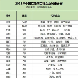 2021中国互联网百强企业城市分布 南京3家代表企业