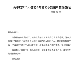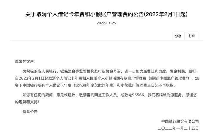 1月25日,中国银行官网发布公告,自2022年2月1日起取消个人借记卡年费和人民币个人小额活期存款账户管理费,用户名下中国银行所有个人借记卡年费(含以往年度欠缴的年费)和小额账户管理费当日起不再收取。