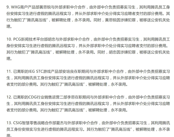 另据通报,腾讯WXG商户产品部黄某、CSIG智慧零售战略合作部夏某、PCG新闻技术平台部胡某、已离职的CDG行业销售运营二部李某、已离职的IEG STC游戏产品部安某等人,利用在校学生渴望去“大厂”实习的心理,在职期间与外部求职中介合作,由外部中介负责招募实习生,上述几人则利用腾讯员工身份安排实习生进行虚假的腾讯远程实习,并从外部求职中介处分得实习应聘者支付的部分费用。