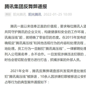 1月25日,腾讯集团反舞弊调查部通过微信公众号“阳光腾讯”通报,2021年,腾讯反舞弊调查部共发现并查处触犯“腾讯高压线”案件50余起,近70人因触犯“腾讯高压线”被辞退,10余人因涉嫌犯罪被移送公安机关处理。此外,腾讯“永不合作主体清单”新增13家企业。