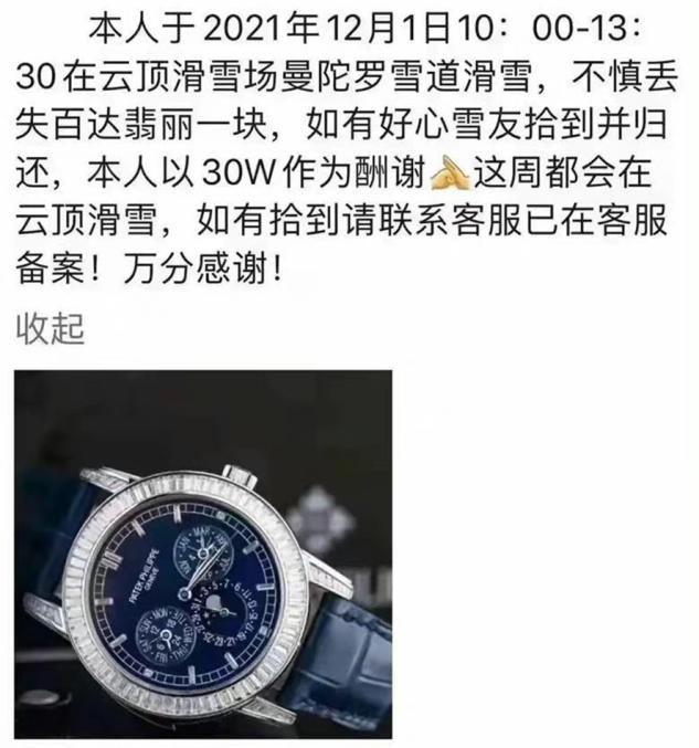 2021年12月,位于张家口市的云顶滑雪场,登出了一则悬赏启事:一名游客悬赏30万元,寻找在雪场丢失的一块百达翡丽手表。而在某二手交易平台上,这款手表的价格为2000万元。