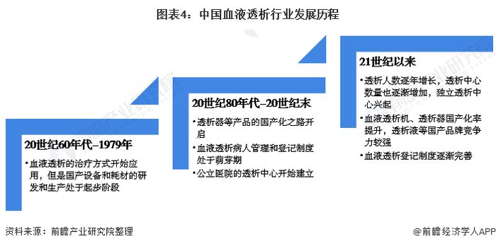 1854年,苏格兰的化学家Thomas Graham首次提出了“透析”的概念,1943年,荷兰医生Kolff制造出了世纪第一台透析机,但在20世纪60年代医院才逐渐开始为病人提供透析治疗。中国血液透析发展于上世纪60年代,1958年中国首次应用血液透析,随后血液透析行业逐渐发展,但是主要使用的设备和耗材基本为国外生产。20世纪80年代-20世纪末期,中国的血液透析耗材,如透析器逐渐研发和生产,开启了国产化之路。北京、上海等地的公立医院开始建立起透析中心,血液透析管理和登记的模式也在萌芽中。21世纪以来,医院血液透析中心规模逐渐增长,独立透析中心开始兴起。中国血液透析病人登记制度逐渐完善,登记人数呈现逐年增长的趋势。血液透析机、透析器等产品国产化率逐渐提升,透析液、透析管路等产品国产化率已经较高。