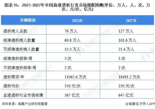 根据历史数据测算,我国血透患者每年约以9%左右的速度进行增长的,由此预测到2021年和2026年中国血液透析人数将分别增长至76万人和116万人左右。设定规律透析人数约为80%、而不规律透析人数占比20%,同时设定规律透析病人透析频率为3次/周、不规律透析病人透析频率为2次/周,每次透析的价格为350元推算,预测到2027年我国血液透析行业市场规模将达到647亿元。