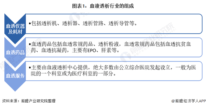 血液透析行业主要包含仪器耗材、药品、服务三大部分。