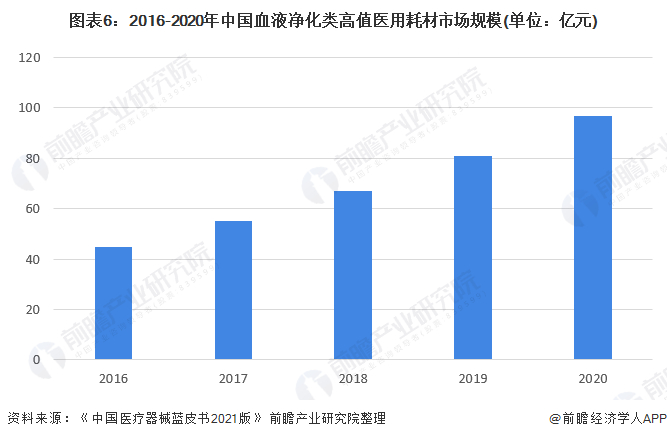 根据《中国医疗器械蓝皮书2021版》,2020年中国血液净化类高值医用耗材为97亿元,同比增长19.75%。