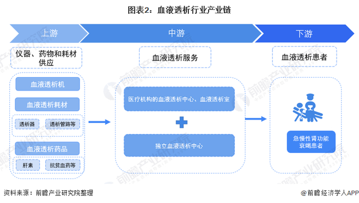 从血液透析的产业链环节看,上游主要是血液透析设备、耗材和药物供应商;中游环节主要包括公立血液透析中心(透析室)和独立透析中心,下游为血液透析患者。