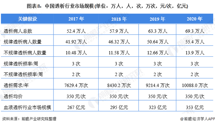 根据中国登记的透析病人数量并设定规律透析人数约为80%、而不规律透析人数占比20%,同时设定规律透析病人透析频率为3次/周、不规律透析病人透析频率为2次/周,每次透析的价格为350元测算,2020年中国血液透析市场规模约为353亿元。