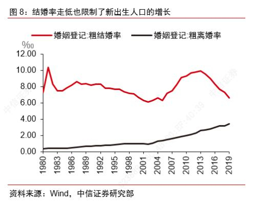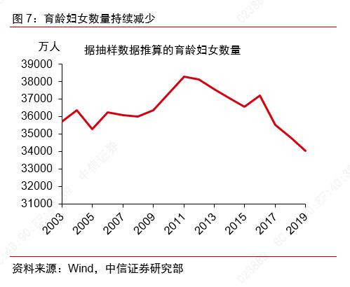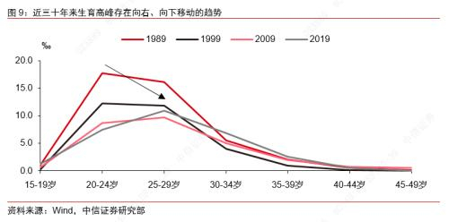 人口基数减少、结婚离婚新形势以及生育年龄延迟,导致育龄妇女数量持续减少。首先,育龄妇女总数逐年下行,通过育龄妇女抽样数和历年抽样比数据,可以大致估计出我国每年的育龄妇女数量,总体而言,全国15-49岁育龄妇女数量自2011年以来逐年下行,由于抽样规模的不同育龄妇女数量在个别年份略有波动,但基本上从2011年的3.8亿人逐渐下降到2019年的3.4亿人。其次,婚姻形势发生新变化,2013年以来,民政部门统计的粗离婚率持续上行,而结婚率持续走低,在我国的社会文化中,总体非婚生子的比例相对较低,因此结婚率走低一定程度上也限制了新出生人口的增长。最后,生育年龄延迟,从1989年以来每隔十年的不同组别的抽样生育率来看,整体反映出了生育率高峰向右移动的趋势,即生育年龄延迟的特点。