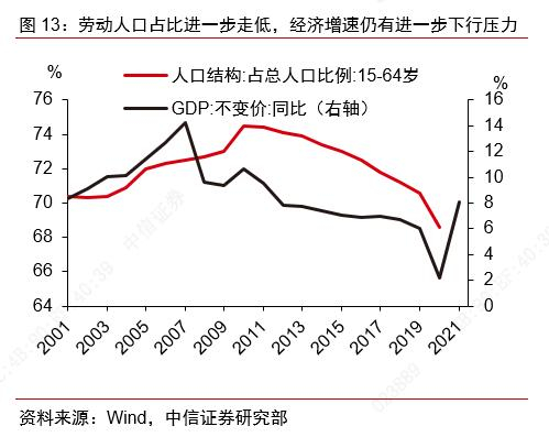 最新人口数据中的另一大结构性特点是劳动年龄人口占比进一步走低,或促使应对老龄化的政策加快施行。最新的人口数据显示,2021年我国劳动年龄(16-59岁)人口共计88222万人,占全国人口的比重为62.5%,较前值64.0%进一步下降1.5个百分点。人口作为经济增长中最重要的要素,其结构的演变会对社会、经济的发展产生直接而深刻的影响,我国15-59岁劳动年龄人口占总人口的比重在2012年出现拐点、开始下行,与我国经济增速开始呈下行趋势的时点基本一致。目前我国经济总量距美国仍有一定差距,人均GDP刚刚迈过1.2万美元大关,随着我国劳动年龄人口占比进一步减少,经济增速仍有进一步下行的压力。提振生育政策将有助于提升我国中长期经济发展水平,但在改善短期经济下行压力方面的作用相对有限,预计应对老龄化政策或将加快施行。