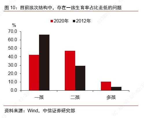 例如,可能要解决目前孩次结构中一孩生育率占比走低的问题。目前新出生人口数据中,除了新出生人口数量在逐年下滑,结构上也呈现出一些新的特点。《中国人口和就业统计年鉴》中抽样调查了新生儿中的孩次结构,即一孩、二孩以及多孩在当年新出生人口中的占比。在实施“二孩政策”以前,2012年的《中国人口和就业统计年鉴》显示(抽样时间区间为2010年11月至2011年10月),新出生人口中,一孩是主要群体,占比达66.4%,而二孩约占三成左右为29.4%,三孩及以上的占比相对较少仅为4.3%;在2020年的年鉴中(抽样时间区间为2018年11月至2019年10月),一孩占比明显下降为42.3%,而二孩成为了主要群体,占比达47.2%,同时三孩及以上的占比明显增加,达10.5%。从中长期来看,当前可生育人群的二孩、三孩的生育意愿释放完毕后,提振生育一孩的意愿是维持总和生育率提升的关键,因此后续政策或将重点解决目前孩次结构中一孩生育率占比走低的问题。