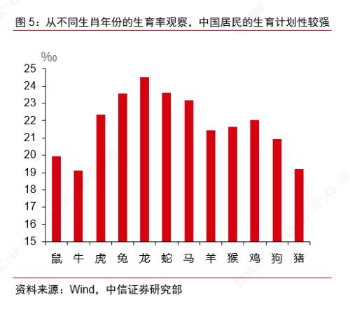 另外,我国居民生育规划性较强,疫情使得部分居民生育计划延后。我国居民的生育计划性较强,一个长期存在的自然现象是生肖属相对生育率的影响,我们统计了自1952年以来至2019年(剔除了受疫情冲击影响较为严重的2020年和2021年的数据)的平均生育率,通常而言,在不同年份间,人口出生率应保持相对平均的水平,但是在图5中可以看到,受我国的传统文化影响,在特定的年份人口出生率呈现明显的分化。在疫情期间,这种生育计划性很大程度上受另一种因素影响,即由于疫情侵占了大量的医疗资源,导致与怀孕相关的术前检查、手术安排以及产后护理等过程变得更为麻烦,引发了部分育龄妇女对住院分娩的担忧,因此也抑制了部分生育计划。在张翠玲(2021)等学者的研究中,可以看到2020年的出生人口下降更多的集中在四季度,尤其是在11~12月份下降更为明显,生育意愿相对更为刚性的30岁以下人群的一孩生育数量,其同比降幅从上半年的17%迅速上升至30~40%,反映了居民部门有计划的生育意愿延迟。