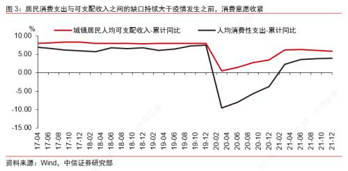 具体来看,疫情持续时间较长,居民整体收入尚未恢复到疫情前趋势水平,消费意愿依旧偏弱。首先,收入取决于就业情况,在2020年和2021年就业人员调查失业率数据中,16-24岁人口的年均失业率分别为14.2%和14.3%,明显高于疫情前2018年和2019年的10.8%和11.9%,即年轻群体的就业状况在疫情期间受到了较为明显的冲击,这将直接抑制他们的收入水平,考虑到年轻群体存款相对较少的情况下,预计将直接影响到他们的生育计划;基于国家卫健委互联互通出生人口检测数据,张翠玲等[1]学者(2021)研究发现,疫情冲击对二孩的抑制弱于一孩,也印证了收入对生育意愿的影响。其次,在个体对未来预期收入改善趋势并不明朗乐观的情况下,也会收紧生育计划,从最新的居民收入数据可以看到,截至2021年四季度,居民消费支出与可支配收入之间的缺口持续大于疫情发生之前,反映了居民部门谨慎收紧的消费观念,其中可能就部分包括原定用于生育的开支。