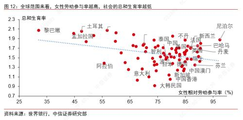再如,可能要解决女性劳动参与率较高的社会条件下,女性职业发展与生育意愿之间的权衡问题。从世界银行提供的全球各国劳动参与率和总和生育率数据中可以看到,在人口总量呈减少趋势的国家(总和生育率小于2.1)中,女性劳动参与率占男性劳动参与率比重越高,社会的总和生育率越低。这一观察表明,在社会预期女性“应当”参与劳动、参加工作的情况下,女性在面临生育选择时,所要付出的机会成本就相对更高,因此可能会导致生育意愿的降低。因此促进生育政策,在降低家庭承担的生育、养育、教育等实际成本之外,还应关注女性因为怀孕、照顾孩子而面临的就业难、职业发展受限的机会成本。