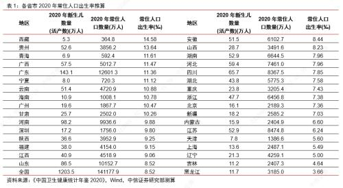 实际上从分省数据来看,目前31个省市中仅有9个省市的常住人口出生率高于1%。我们综合各省市陆续发布的2020年统计年鉴以及2021中国卫生健康统计年鉴推断各省份的常住人口出生率。卫生健康统计年鉴提供了各地孕产妇保健情况,其中统计了各地区活产婴儿数量,值得注意的是,这一数量与户籍人口统计口径下的新出生人口数量略有差别,但差异不影响趋势分析。基于卫生健康统计年鉴数据与各省市常住人口数量,可以粗略估计常住人口口径下的人口出生率(详见表1),可以看到全国31个省市中,仅有9个省市的常住人口出生率大于1%,例如西藏、贵州、青海等省份的常住人口出生率大于1%,其他省份普遍低于正常年份的平均水平。