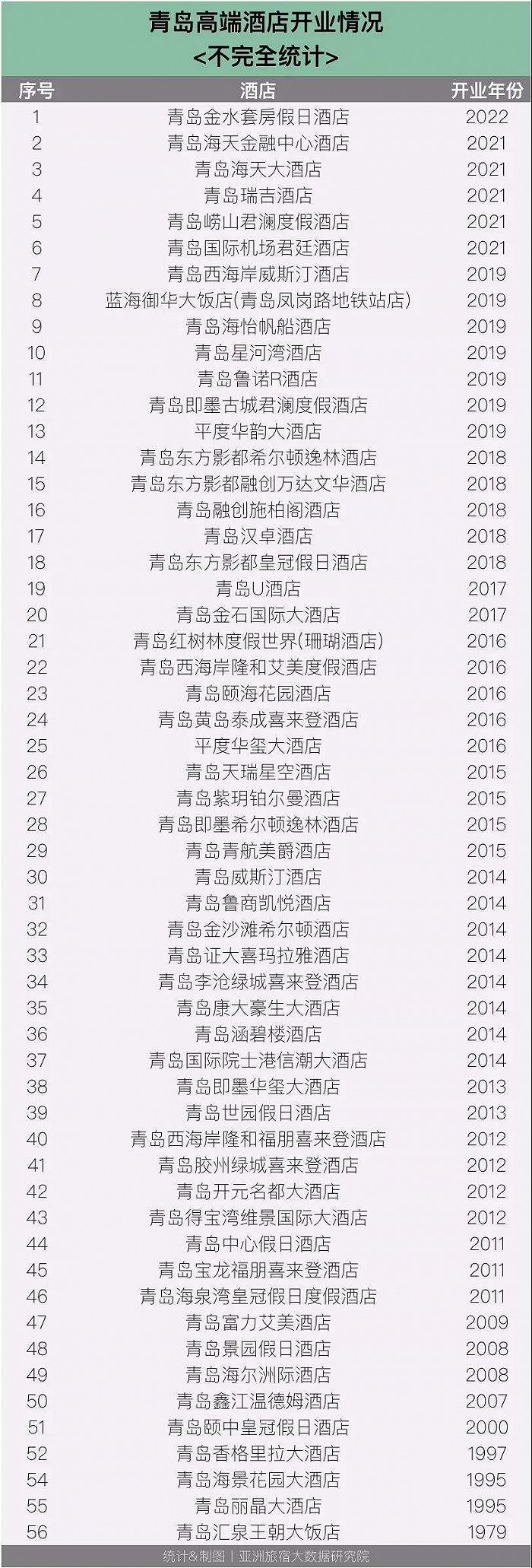 2021年,青岛在宜居宜游城市竞争力排名中列全国第2,在游客满意度排名中列全国第6,在旅游投资热点城市排名中列全国第10,为高端酒店入局,提供了足够底气。据亚洲旅宿大数据研究院不完全统计,青岛未来待开业高端酒店为8家,与深圳相同,仅次于上海的12家。