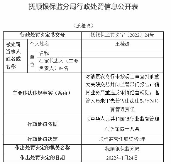 抚银保监罚决字〔2022〕24号显示,王桂波对清原农商行未按规定审查批准重大关联交易并向监管部门报告;信贷业务严重违反审慎经营规则;高管人员未审先任等违法违规行为负有管理责任。抚顺银保监分局依据《中华人民共和国银行业监督管理法》第四十八条,对王桂波取消高管任职资格2年。