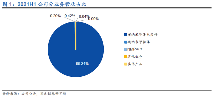 江苏天奈科技股份有限公司成立于2011年,2019年在上交所科创板上市,是一家从事纳米级材料及相关产品的研发、生产及销售的高新技术企业,是国内最大的碳纳米管生产企业,公司在碳纳米管及其相关复合材料领域处于全球领先水平。公司的主要业务产品包括碳纳米管导电浆料、碳纳米管粉体、NMP加工及其他产品和业务。根据公司2021年半年报,碳纳米管导电浆料的销售占比高达99.34%、碳纳米管粉体销售占比0.42%、NMP加工业务占比0.2%,产品业务高度集中。
