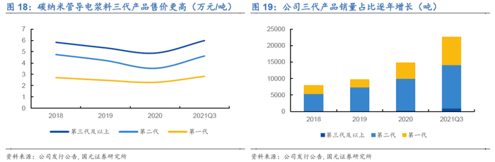 碳纳米管导电浆料产品结构优化,高价产品销量占比增加。公司依托清华大学研发团队,自研三代催化剂技术,其中第三代产品采用尖晶石复合结构,含有钴、镁、锰、铝等催化剂,使用高温固相反应法,得到的催化剂具有较高的活性,能够提升制备碳纳米管的效率,且制成的碳纳米管管径分布小,比表面积大,导电性能好。相比前两代产品,第三代产品具有更高的单价,销量也从2018年42.64吨迅速提升至2021年前三季度的973.4吨。