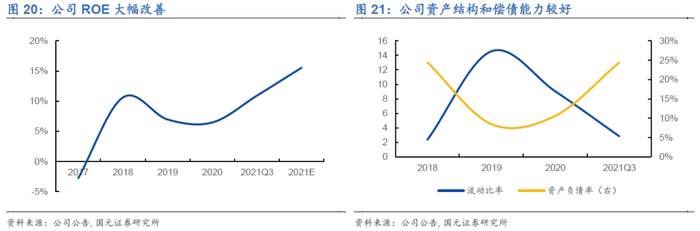 产能持续释放,盈利能力显著改善,偿债能力较强。公司具有一体化优势,全球化布产,常州5万吨新增产能预计于2022年逐步释放,美国0.8万吨新建产能预计将于2023-2024年逐步释放,届时产能将达到13万吨。随着产能的释放,公司ROE持续改善,2021全年有望达到15.6%,为上市以来最高。此外,公司资产负债率为14%,低于同行水平,流动比率2.84,高于行业水平。