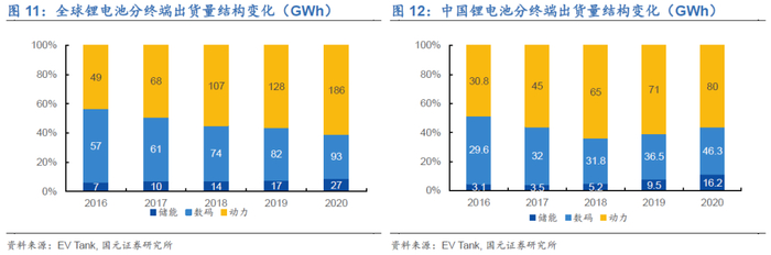 2020年全球锂电池出货量306GWh,同比增长34.6%,中国市场为158.5GWh。得益于欧洲新能源汽车市场的超预期增长,全球汽车用动力电池出货量同比增长26.4%,达到158.2GWh,中国市场汽车用动力电池出货量为84.5GWh。除此之外,3C端需求增长,储能、小动力等细分市场锂电渗透率加速,带动电池需求量提升。