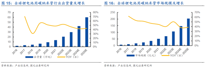 全球碳纳米管市场规快速扩大。受益于全球锂电池行业的高景气度,叠加动力电池的高镍化趋势,全球碳纳米管市场规模有望快速扩大,预计2025年全球碳纳米管导电浆料需求量到需求量将达59.6万吨,届时市场规模将达到202.6亿元。