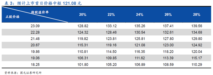 参考相近行业、相似评级的川恒转债(评级AA-、规模11.6亿元,平价110.42元对应转债价格150.69元,转股溢价率36.47%)、博杰转债(评级AA-、规模5.26亿元,平价91.64元对应转债价格129元,转股溢价率40.77%)。由于公司正股目前估值较高,承受了较大的估值压力,综上,我们预计上市首日转股溢价率在20%-28%之间,价格115.31-124.92元,价格中枢121.08元。