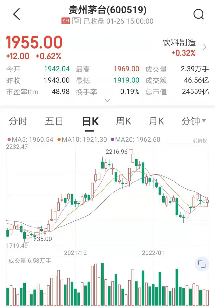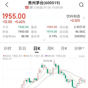 1月26日,贵州茅台股价上涨0.62%,收报1955元/股,市值24559亿元。