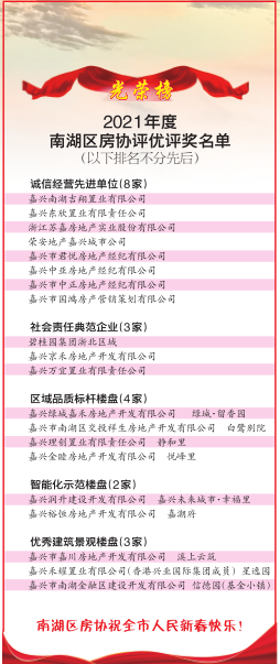 记者昨天从南湖区房协了解到,为进一步加强协会自身建设,营造行业内争先创优的良好氛围,切实履行社会责任,激发各会员单位参与行业建设的热情,发挥优秀企业、精品项目的示范引领作用,共同推动南湖区房地产业高质量发展,助力共同富裕典范城市建设,经单位申报、区房协专家组综合评议、区房协审定,表彰了一批先进单位及优秀项目,包括诚信经营先进单位、社会责任典范企业、区域品质标杆楼盘、智能化示范楼盘和优秀建筑景观楼盘。