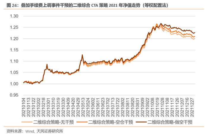 从2021年表现来看,我们发现手续费上调事件确实对时序趋势策略具有严重的负面影响。考虑到上调后的价格反转效应在前期涨幅较大的品种中更为明显,若在上调事件后采取无为而治(空仓)甚至是反手做空的干预方式理论上能在一定程度减小回撤风险。