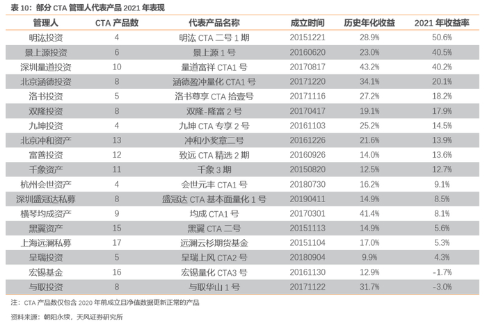 最后,我们根据管理人在管产品数量、产品成立时间筛选了部分CTA管理人,并以其成立时间较早且净值信息相对完整的产品作为其代表产品。从我们统计的18家私募基金的CTA代表产品2021年表现来看,收益前三的是明汯CTA二号1期、景上源1号和量道富祥CTA1号。